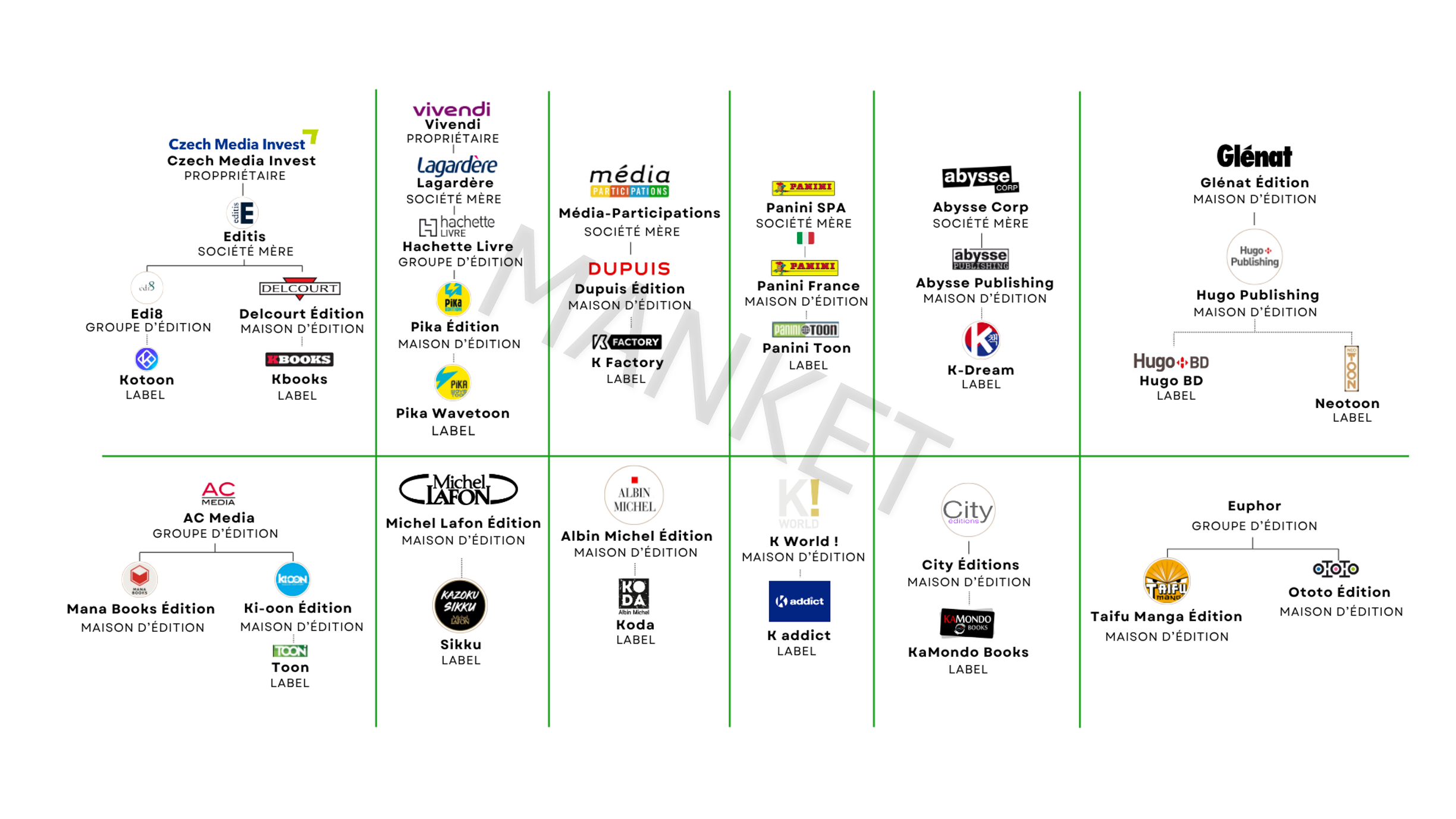 Les trois plus gros groupes éditoriaux de France (Editis, Hachette et Média-Participations) sont présents sur ce marché grâce à leurs maisons d’édition spécialisées dans la bande dessinée : Delcourt et Dupuis. Dans le cas de Hachette, c’est l’éditeur de medium manga, Pika qui s’est lancé dans cette aventure grâce à son label Pika Wavetoon. Cependant, le groupe Editis reste le leader du secteur, que ce soit en termes de ventes[3], de nombre de labels dédiés au webtoon printoonisé (Kotoon et Kbooks) ou même de production éditoriale :