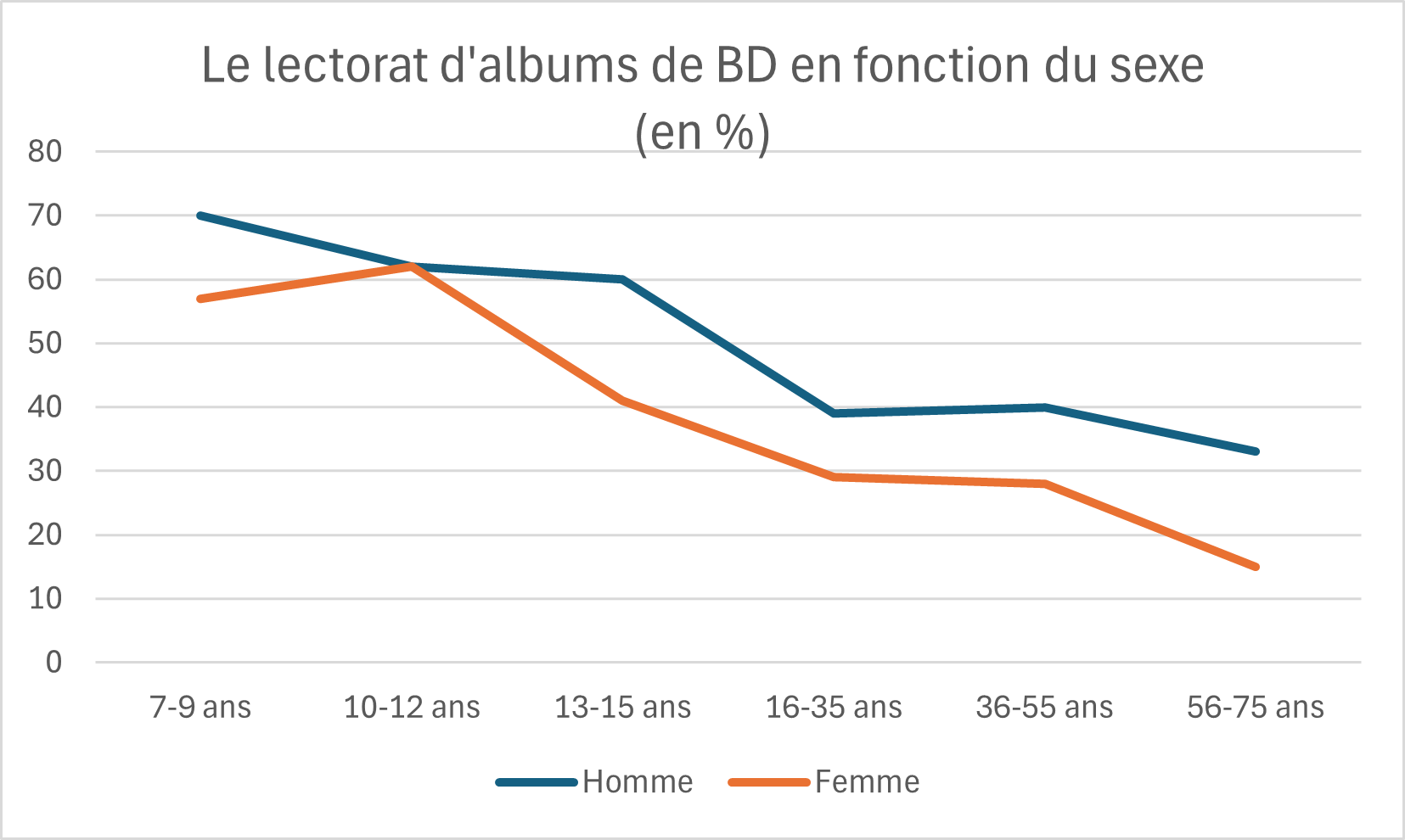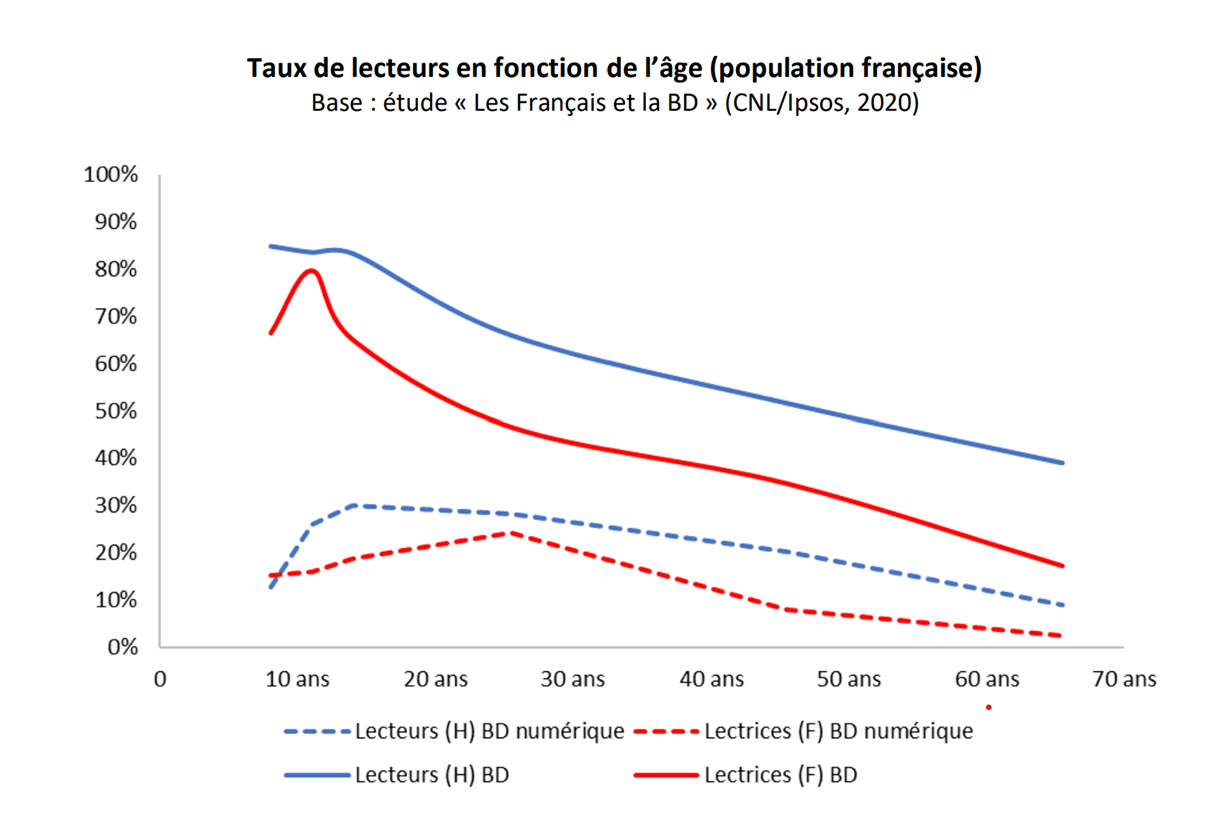 « Entre 1988 et 2018, on y observe ainsi une structure inchangée du lectorat féminin, qui se répartit grossièrement en 50 % de lectrices occasionnelles (1 à 4 bandes dessinées lues au cours des 12 derniers mois), 40 % de lectrices moyennes (entre 5 et 19 bandes dessinées lues) et autour de 10 % de grosses lectrices (plus de 20 bandes dessinées lues) ». En d’autres termes, on peut conclure qu’il n’y a pas eu de féminisation du lectorat au fil des années. (Panorama de la bande dessinée en France, 2021, CNL)