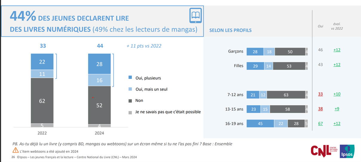 - Les jeunes Français et la lecture en 2024, CNL et Ipsos, 2024, disponible sur : https://centrenationaldulivre.fr/donnees-cles/les-jeunes-francais-et-la-lecture-en-2024 (consulté le 8 novembre 2025).