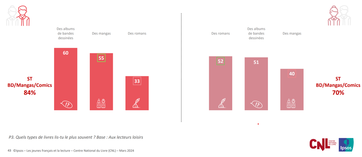 Tout d’abord, il est essentiel de comprendre que le lectorat de bande dessinée a toujours été plus masculin que féminin[2]. Historiquement, la BD était publiée dans des magazines plutôt destinés aux jeunes garçons (Pilote, Spirou…). Le lectorat féminin n’était donc pas le cœur de cible d’origine. De plus, sociologiquement, les femmes ne se dirigent pas vers les mêmes types de lectures que les hommes (du fait d’un processus de socialisation différencié en fonction du sexe). Ainsi, les hommes ont plus tendance à s’intéresser à des récits d’aventure ou de science-fiction (thématiques assez présentes dans la bande dessinée), quand les femmes se dirigeront plutôt vers des récits sentimentaux ou policiers (dans le cas du roman). Cela pourra vous sembler cliché, mais il s’agit d’une réalité sociologique que l’on ne peut nier. Ainsi, si l’on prend la dernière étude statistique du CNL et de Ipsos, Les jeunes Français et la lecture de 2024, voici les types de romans lus par les jeunes (7-19 ans) en fonction de leur sexe :
